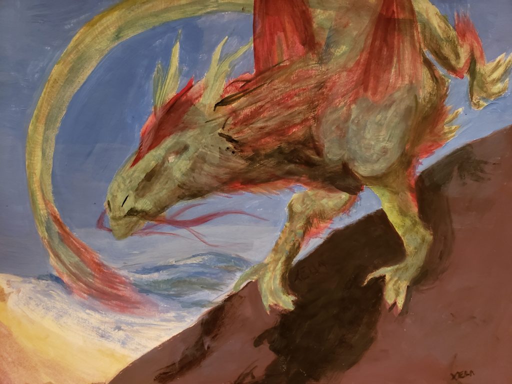 From stretched canvas to canvas board Acrylic Paintings can capture a variety of subjects. Xela has abstract pieces and Landscapes alongside her painted monsters.